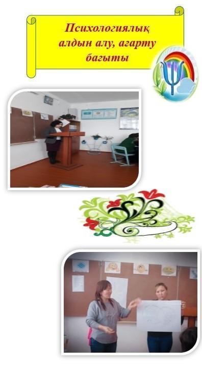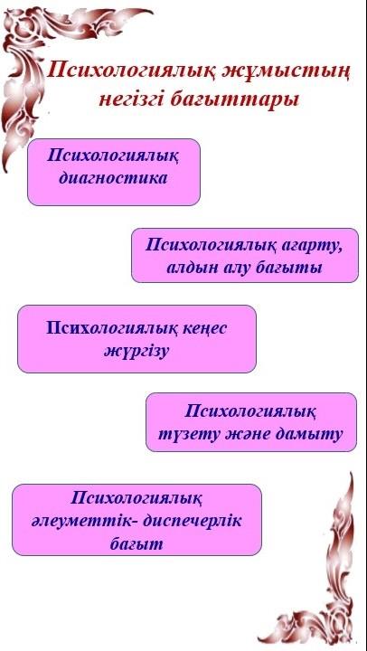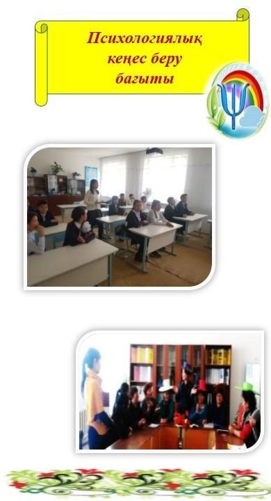 Мақсаты: Даму мен оқу- тәрбиелеу процесін психологиялық қамтамасыз ету, білім беру процесіне қатысушылардың психологиялық денсаулығын қорғау, оқыту мен тәрбиелеу процесін ұйымдастыру және жүргізу.