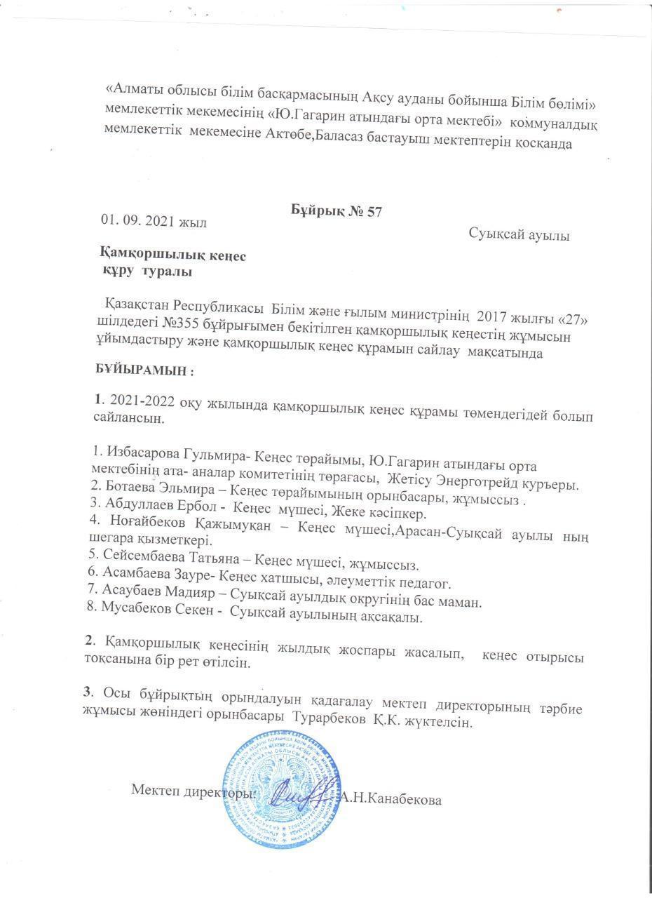 Бұйрық 2021-2022 оқу жылы » Жетісу облысы, Ақсу ауданы, «Юрий Гагарин атындағы орта мектебі» Education Department of Kerbulak district